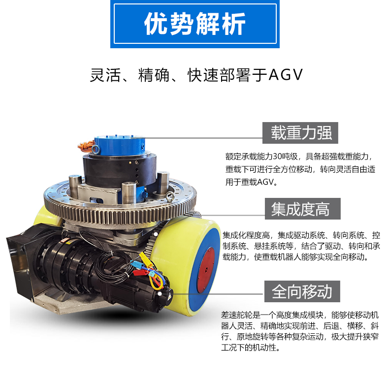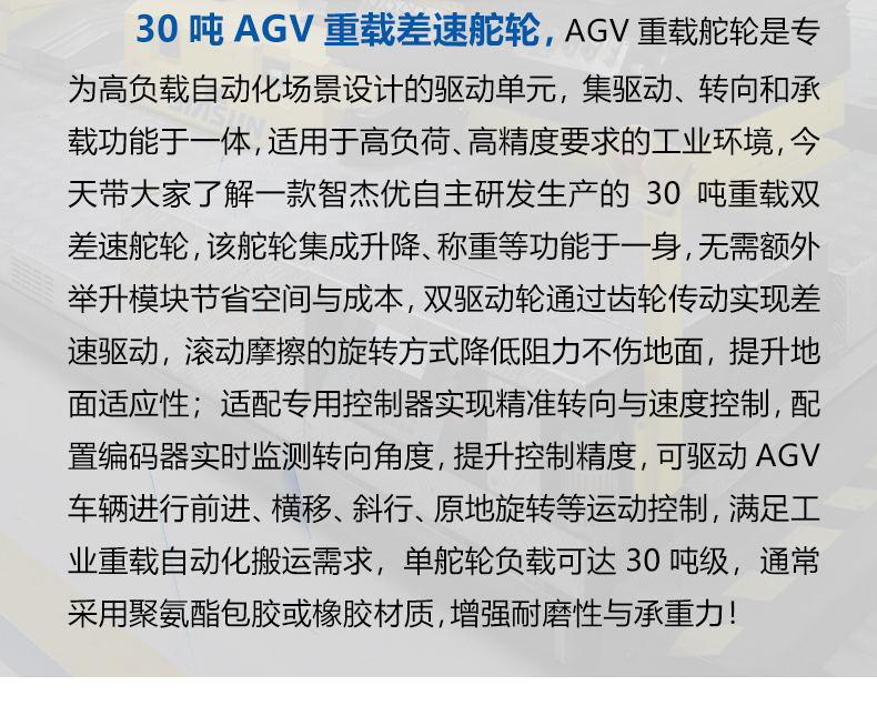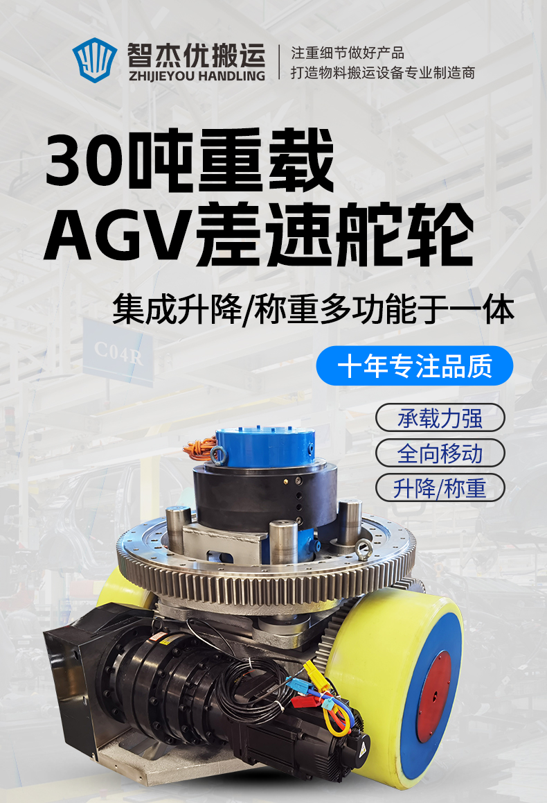 描   述: AGV重載舵輪是專為高負(fù)載自動化場景設(shè)計的驅(qū)動單元,集驅(qū)動、轉(zhuǎn)向和承載功能于一體,適用于高負(fù)荷、高精度要求的工業(yè)環(huán)境,智杰優(yōu)自主研發(fā)生產(chǎn)的30噸重載雙差速舵輪,集成升降、稱重等功能于一身,無需額外舉升模塊節(jié)省空間與成本,雙驅(qū)動輪通過齒輪傳動實現(xiàn)差速驅(qū)動,滾動摩擦的旋轉(zhuǎn)方式,降低阻力不傷地面,提升地面適應(yīng)性。