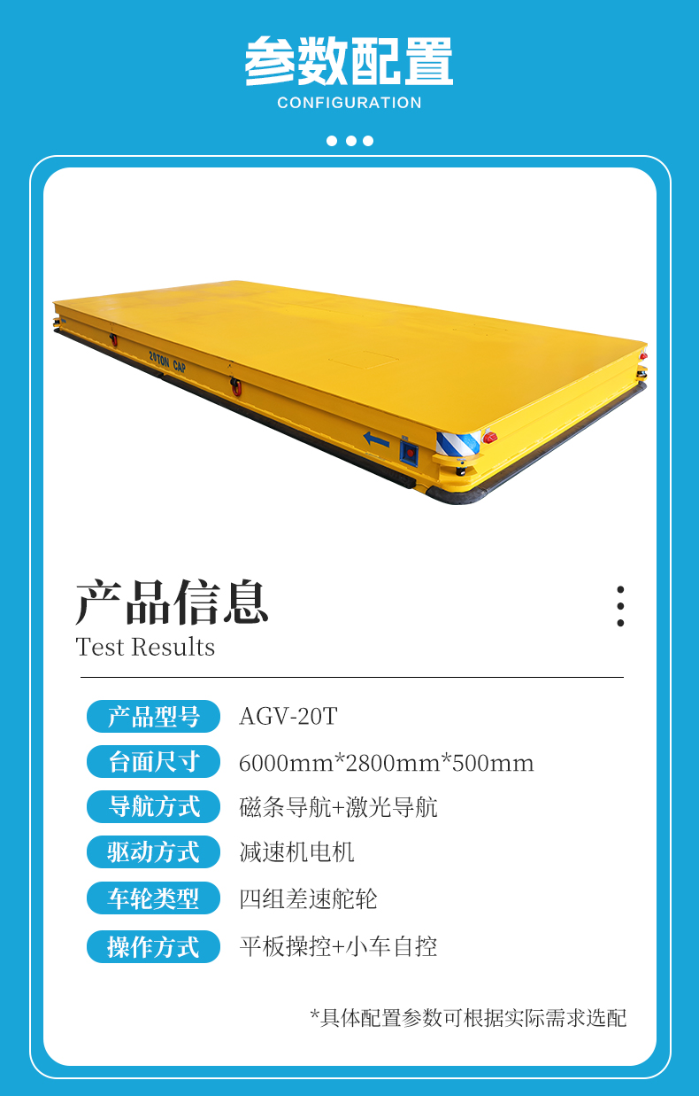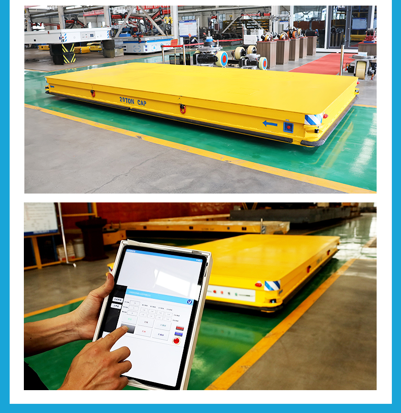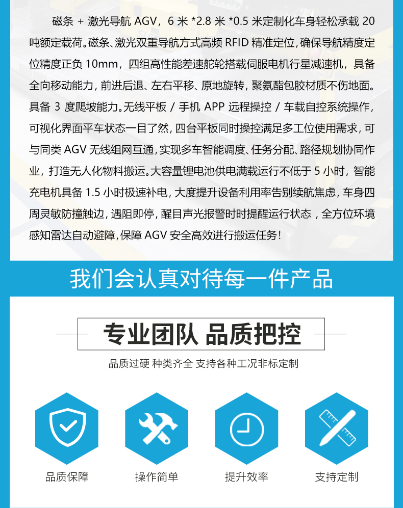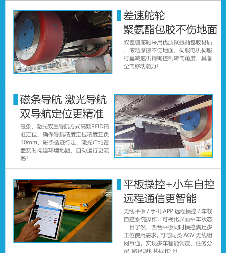 描   述: 磁條+激光導(dǎo)航AGV,6米*2.8米*0.5米定制化車身輕松承載20噸額定載荷。磁條、激光雙重導(dǎo)航方式高頻RFID***定位,確保導(dǎo)航精度定位精度正負(fù)10mm,四組高性能差速舵輪搭載伺服電機(jī)行星減速機(jī),具備全向移動能力,前進(jìn)后退、左右平移、原地旋轉(zhuǎn),聚氨酯包膠材質(zhì)不傷地面。具備3度爬坡能力。無線平板/手機(jī)APP遠(yuǎn)程操控/車載自控系統(tǒng)操作,可視化界面平車狀態(tài)一目了然,四臺平板同時操控滿足多工位使用需求