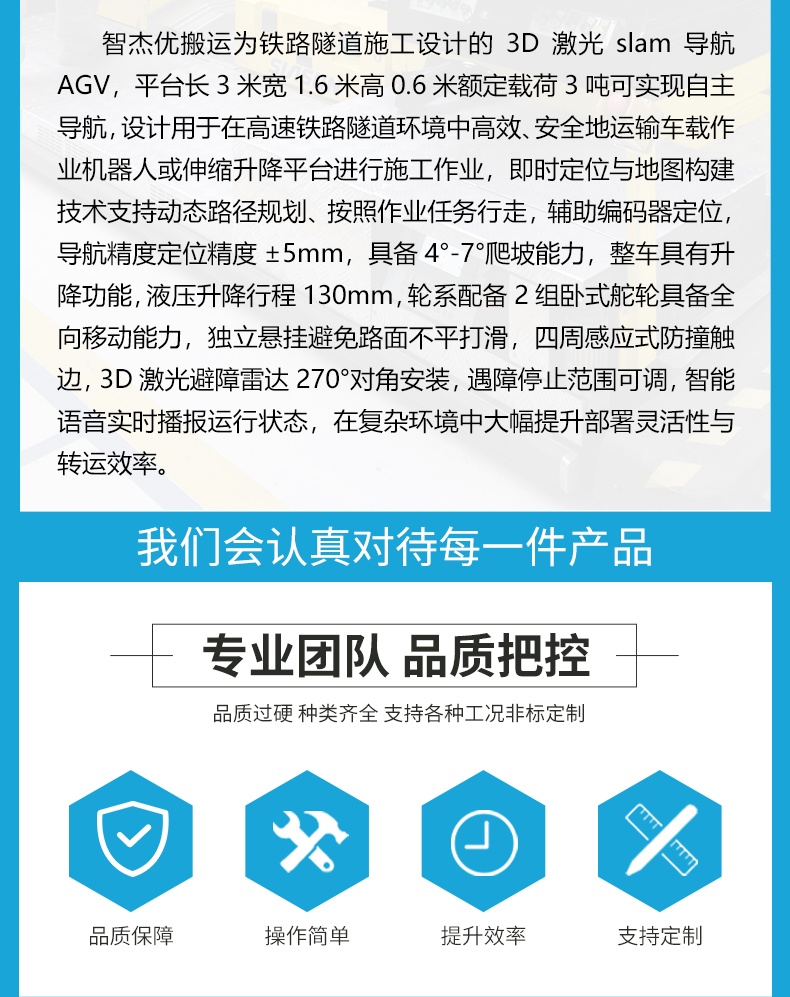 描   述: 3D激光SLAM導(dǎo)航AGV用于隧道內(nèi)運(yùn)輸車載作業(yè)機(jī)器人或升降平臺(tái)進(jìn)行施工作業(yè)。采用3D激光slam即時(shí)定位與地圖構(gòu)建導(dǎo)航技術(shù),結(jié)合編碼器輔助定位,導(dǎo)航精度定位精度±5mm,靜態(tài)環(huán)境、動(dòng)態(tài)場(chǎng)景都能實(shí)時(shí)構(gòu)建高精度三維地圖,自主導(dǎo)航與動(dòng)態(tài)路徑規(guī)劃,讓AGV擺脫對(duì)預(yù)置標(biāo)記物的依賴,能快速適應(yīng)變化的作業(yè)場(chǎng)景大幅提升部署靈活性與效率。