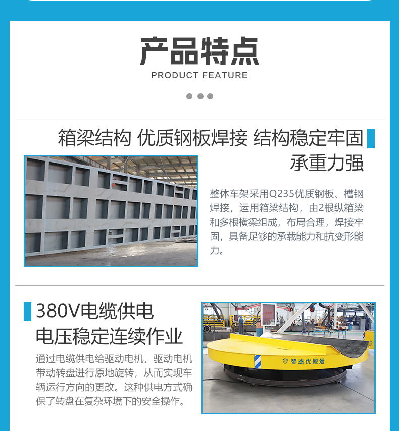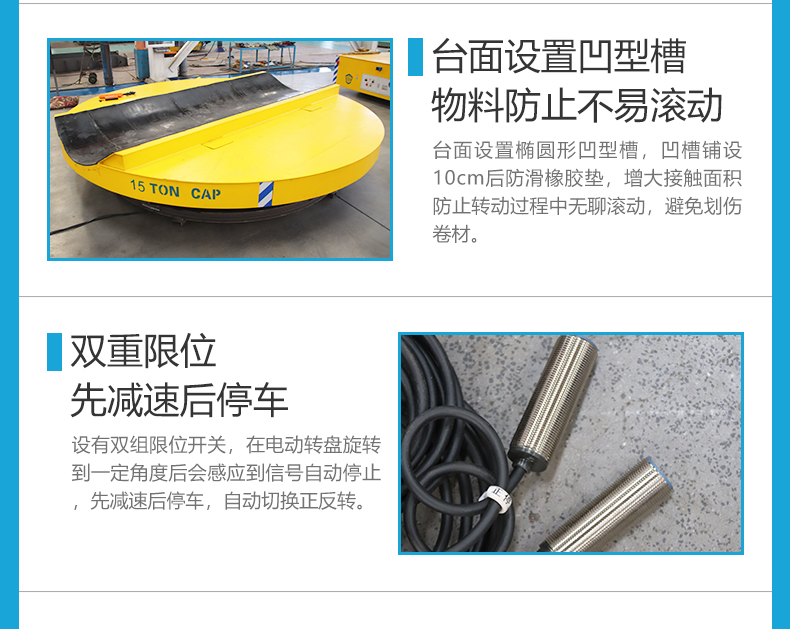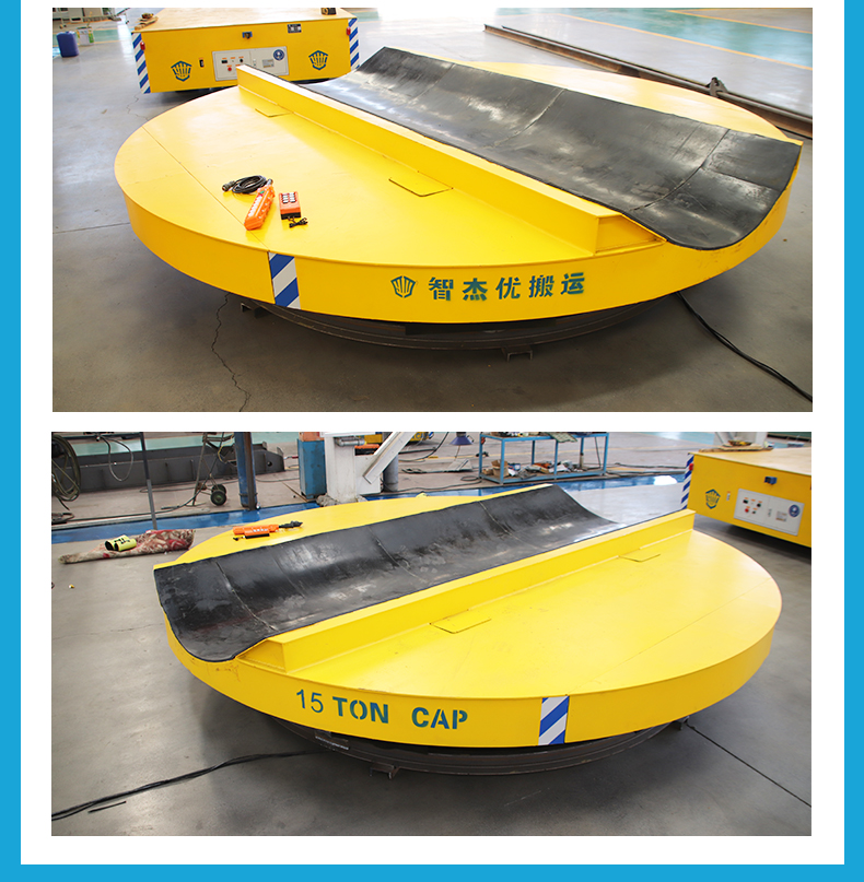 直徑3.5米載重15噸的電動轉(zhuǎn)盤旋轉(zhuǎn)臺,客戶用于直徑1.5米長10米復(fù)合材料卷的原地掉頭作業(yè),平臺上方設(shè)置橢圓形凹槽方便物料放置,上方鋪設(shè)10cm厚橡膠防滑墊,防止在旋轉(zhuǎn)過程中物料晃動避免劃傷物料,通過設(shè)置限位開關(guān)雙重限位,旋轉(zhuǎn)到180度自動先減速再緩慢停車,無線遙控控制轉(zhuǎn)盤正反轉(zhuǎn)操作簡單方便,采用電機(jī)減速機(jī)驅(qū)動,啟動平穩(wěn)緩慢無沖擊,380V電纜線供電不受蓄電池容量限制,可全天候連續(xù)作業(yè),旋轉(zhuǎn)速度可調(diào)節(jié),設(shè)有高中低三個檔位,電磁制動斷電自動剎車,聲光報警時刻提醒工作人員注意避讓安全性高,結(jié)構(gòu)穩(wěn)定維護(hù)簡單,電動轉(zhuǎn)盤的運(yùn)用,幫助客戶解決長物料掉頭難的問題節(jié)省人力提升效率,智杰優(yōu)搬運(yùn)專注各種類型搬運(yùn)設(shè)備非標(biāo)定制,咨詢我獲取同款車型報價!
