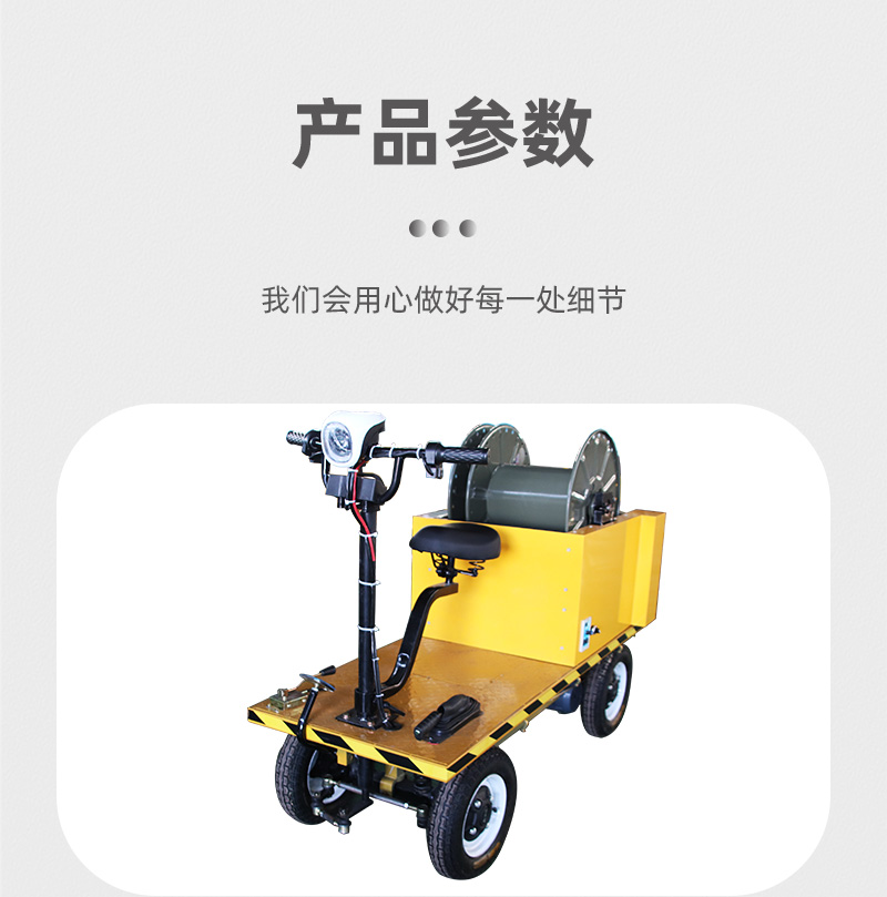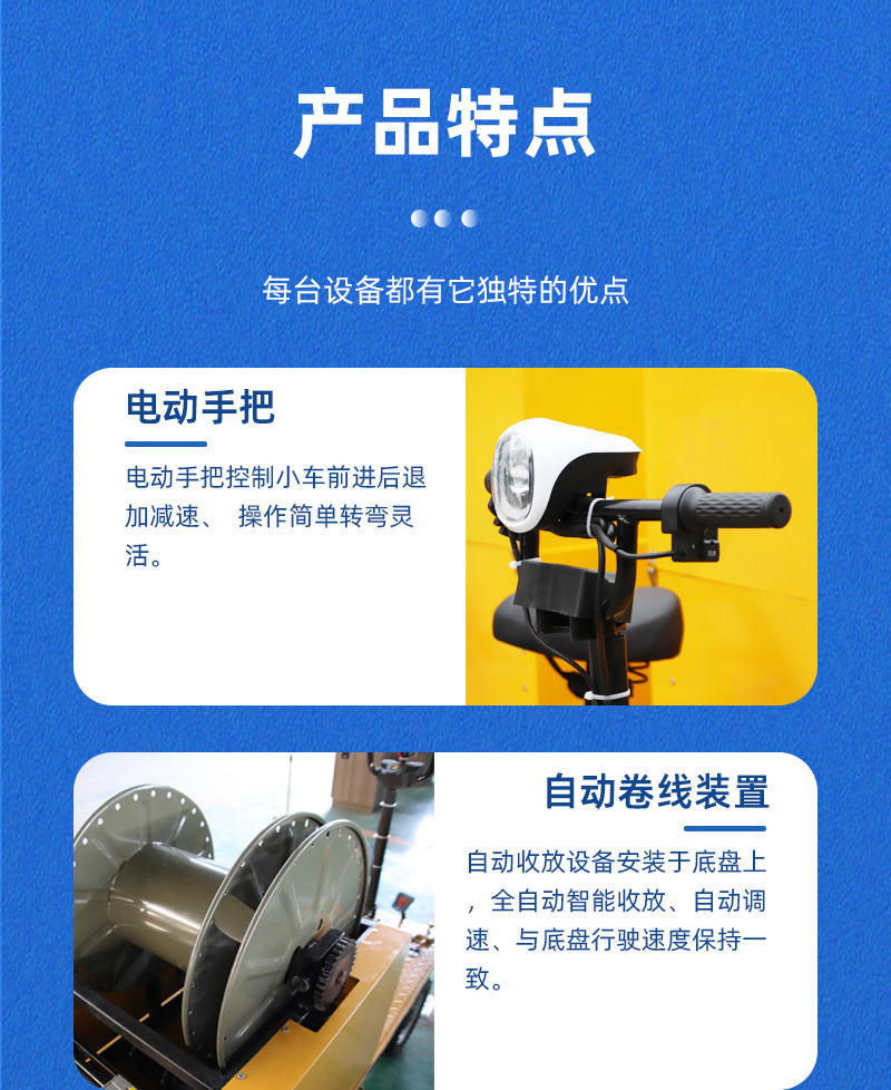 熱線:15517329551 全自動(dòng)收放線無(wú)軌電動(dòng)平板車(chē),整車(chē)長(zhǎng)1.5米寬0.6米高1.2米,四輪越野底盤(pán),充氣橡膠輪胎、電動(dòng)手把操控,蓄電池供電操作簡(jiǎn)單運(yùn)行自由速度可控,橡膠輪胎能滿足顛簸路段、沙地等復(fù)雜路段行駛,小車(chē)后方裝有自動(dòng)收放電纜線卷筒,全自動(dòng)智能收放、自動(dòng)調(diào)速自動(dòng)擺線,卷筒速度可與小車(chē)行駛速度保持一致。