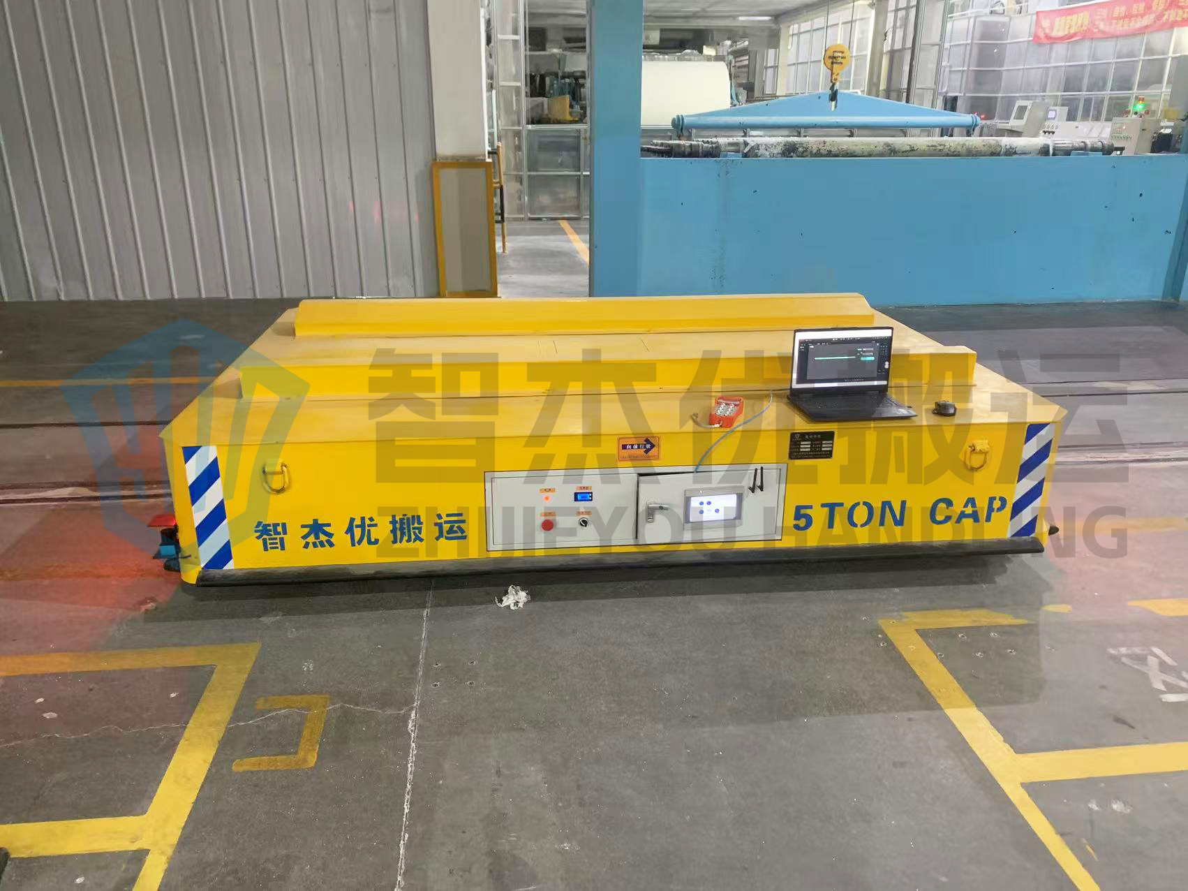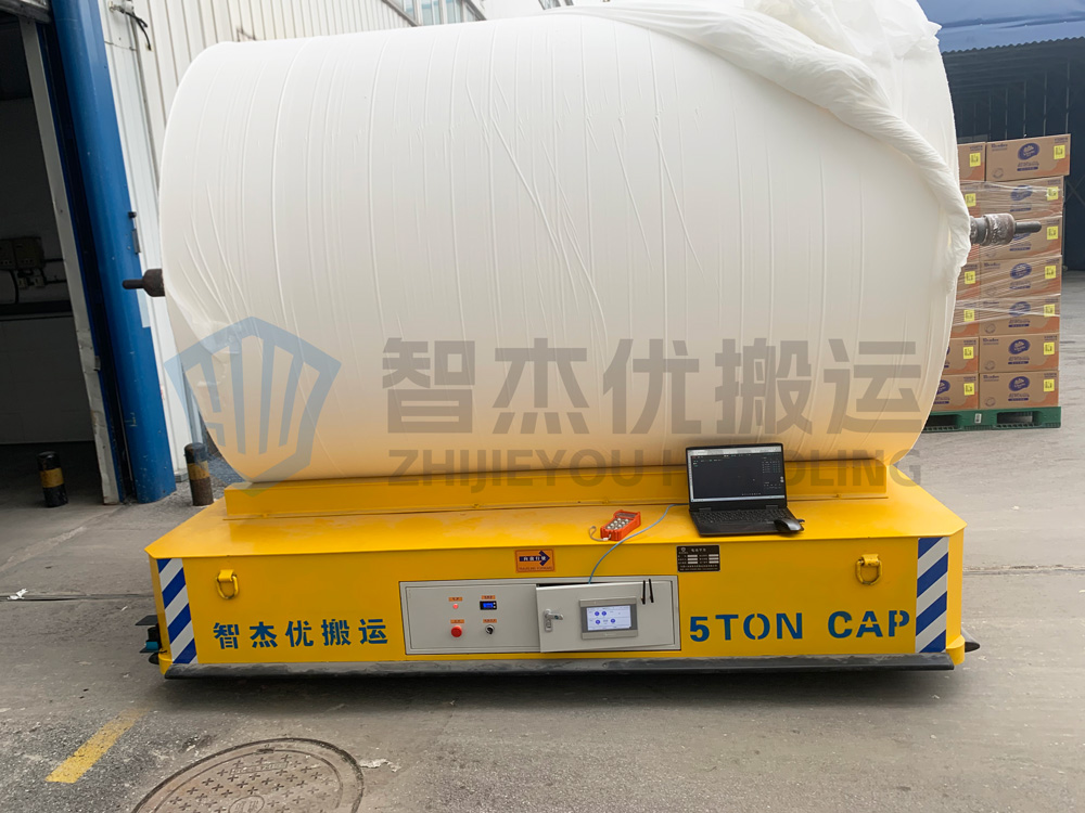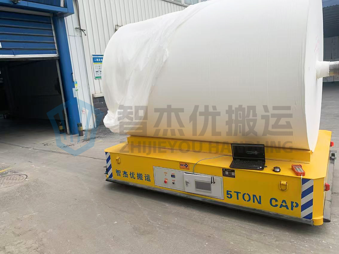 整車長3米寬2.1米高0.6米額定載重5噸,主要用于紙卷的跨車間轉(zhuǎn)運作業(yè),車體經(jīng)過定制化設(shè)計,臺面加裝可拆卸V型置物架,方便紙卷放置避免滾動。