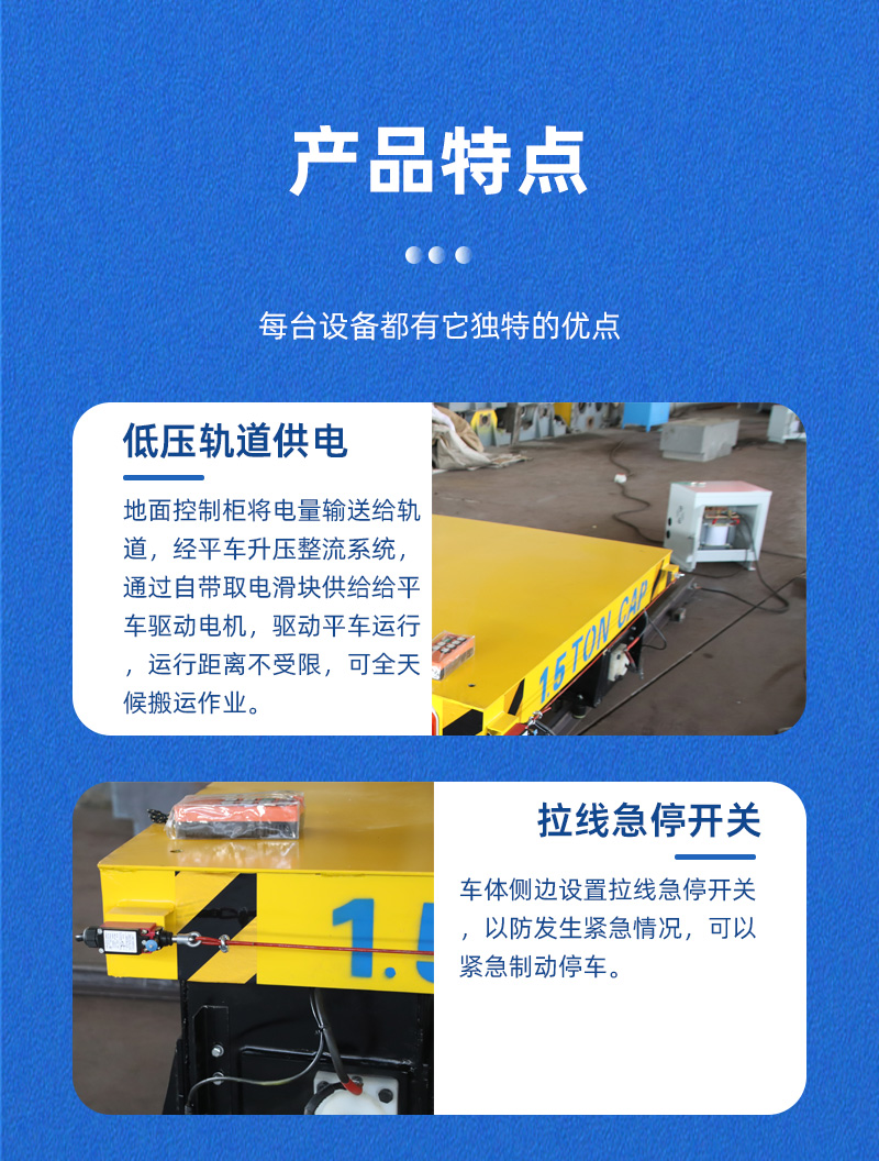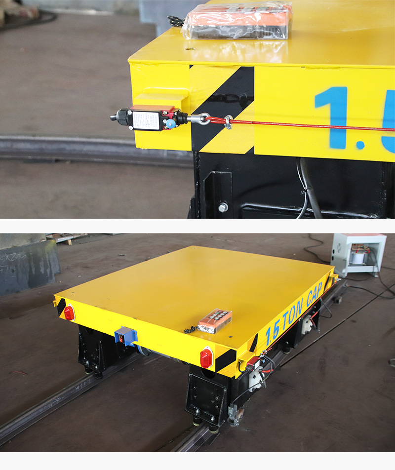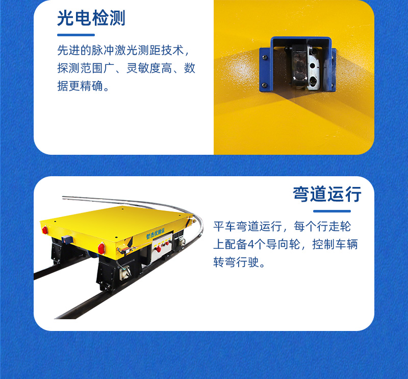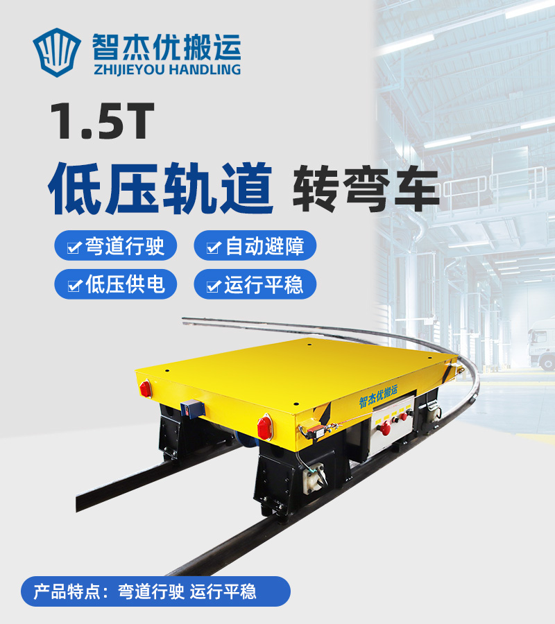 熱線:15517329551 轉(zhuǎn)彎軌道電動(dòng)平車,整車長(zhǎng)1.4米寬1.2米高0.5米載重1.5噸,采用低壓軌道供電方式為平車提供電力,通過地面控制柜將電纜線連接軌道,再經(jīng)平車升壓整流系統(tǒng)輸送給牽引電機(jī),驅(qū)動(dòng)平車運(yùn)行,車輪均做絕緣處理確保沒有觸電風(fēng)險(xiǎn),該種供電方式不受續(xù)航能力限制,可根據(jù)需要靈活調(diào)整線路及搬運(yùn)任務(wù),人工無(wú)線遙控操作,車體側(cè)邊設(shè)置拉線急停開關(guān),前后配備光電檢測(cè),確保行車安全。