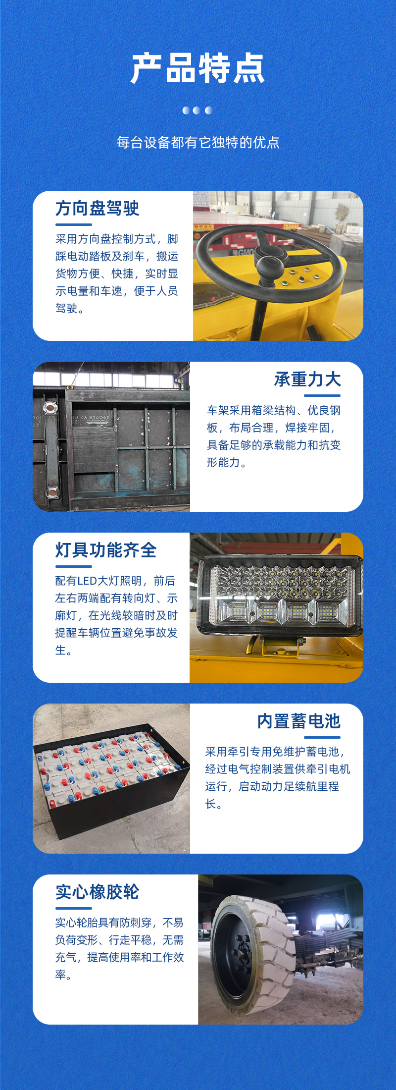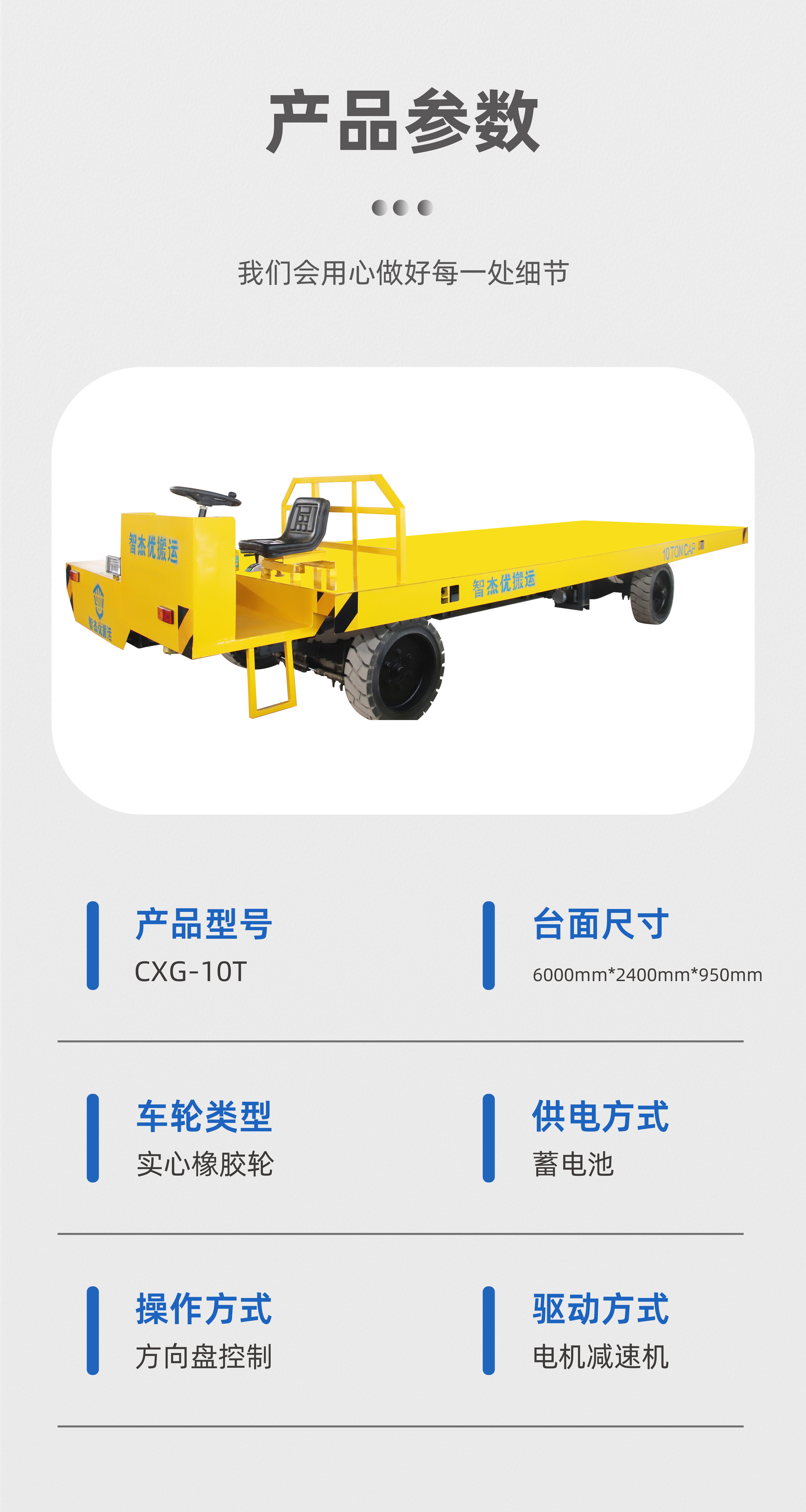 描   述: CXG-10T敞篷式蓄電池?zé)o軌搬運車貨物轉(zhuǎn)運平板車,整車長6米寬2.4米高0.95米,載重10噸,采用實心橡膠輪胎無需充氣,耐刺穿耐變形防滑耐磨爬坡能力強,行走平穩(wěn);敞篷式方向盤駕駛,自帶液壓助力轉(zhuǎn)向,轉(zhuǎn)向靈活,運行自由,控制車輛前進后退左右轉(zhuǎn)彎,腳踩電動踏板及剎車,搬運貨物方便快捷,配有LED大燈照明、轉(zhuǎn)向燈、示廓燈確保車輛運行安全,采用免維護蓄電池供電,啟動動力足、續(xù)航里程長!