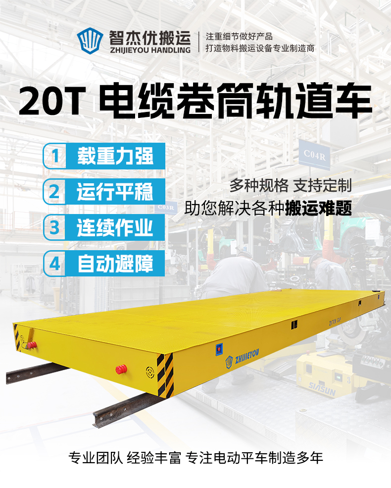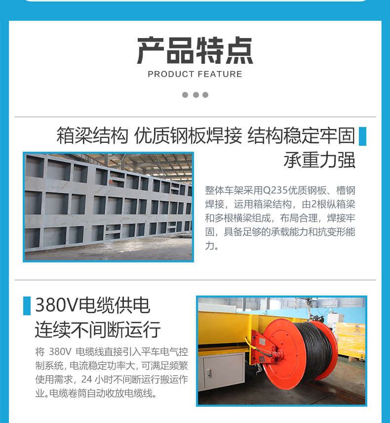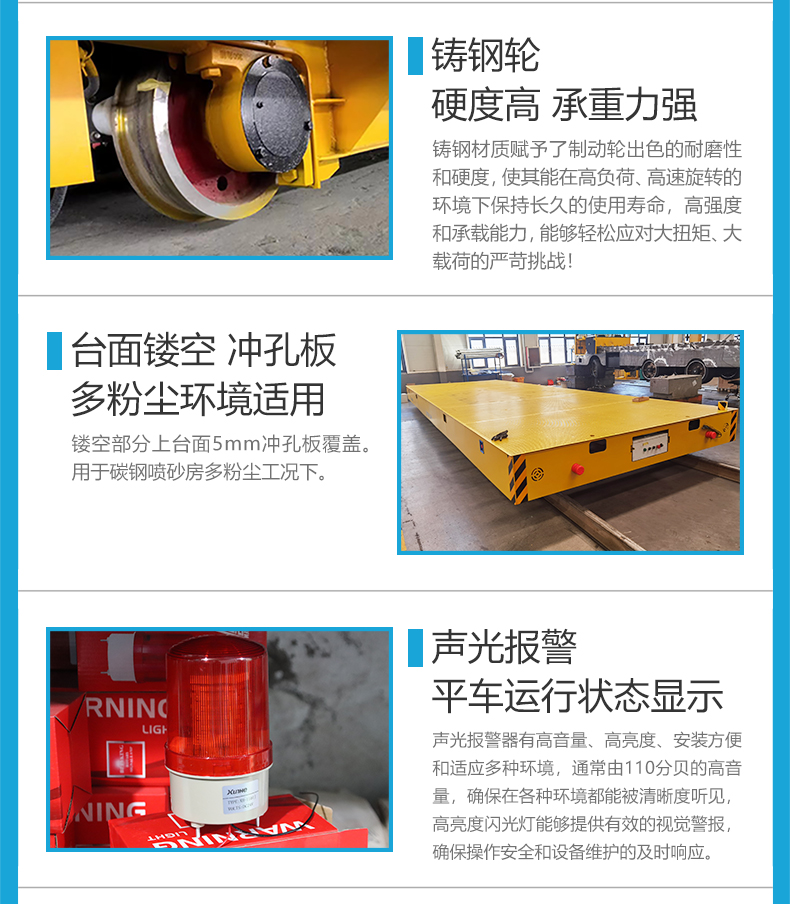描   述: 噴砂房專用軌道電動(dòng)平板車(chē),9米*2.5米超大平臺(tái)設(shè)計(jì),搭載20噸額定載重能力,輕松承載各類大型工件及設(shè)備進(jìn)入噴砂房進(jìn)行噴砂處理。5mm沖孔板全覆蓋臺(tái)面,孔距精密排布,噴砂粉末實(shí)時(shí)漏出減少臺(tái)面堆積,門(mén)口集中控制盒操作,人員無(wú)需跟車(chē)移動(dòng)。電纜卷筒供電滿足全天候使用需求。