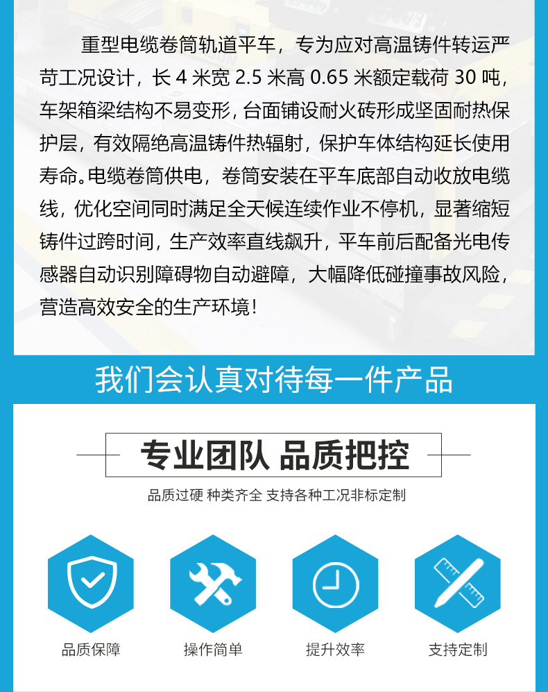 描   述: 重型電纜卷筒軌道平車,專為應(yīng)對高溫鑄件轉(zhuǎn)運(yùn)嚴(yán)苛工況設(shè)計(jì),長4米寬2.5米高0.65米額定載荷30噸,車架箱梁結(jié)構(gòu)不易變形,臺面鋪設(shè)耐火磚形成堅(jiān)固耐熱保護(hù)層,有效隔絕高溫鑄件熱輻射,保護(hù)車體結(jié)構(gòu)延長使用壽命。電纜卷筒供電,卷筒安裝在平車底部自動(dòng)收放電纜線,優(yōu)化空間同時(shí)滿足全天候連續(xù)作業(yè)不停機(jī),顯著縮短鑄件過跨時(shí)間,生產(chǎn)效率直線飆升,平車前后配備光電傳感器自動(dòng)識別障礙物自動(dòng)避障,大幅降低碰撞事故風(fēng)險(xiǎn)!