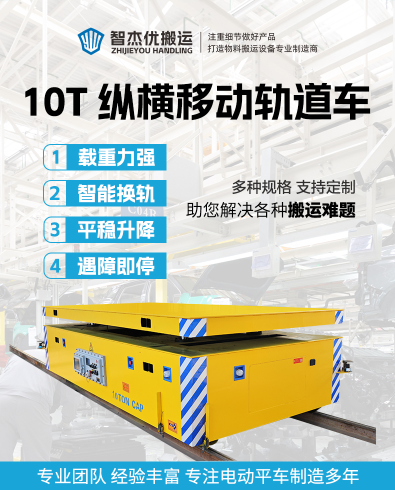 熱線:15517329551 十字交叉路線自動(dòng)換軌軌道車,8組鑄鋼輪+升降換軌系統(tǒng),平車行駛至十字交叉換軌點(diǎn)自動(dòng)???**定位,人工遙控一鍵換軌瞬間完成行走路線的橫向切換,極大優(yōu)化有限空間物流路徑,4米*2米大平臺(tái)輕松容納大型工件或模具,箱梁車架10噸重載平穩(wěn)運(yùn)行,臺(tái)面集成液壓升降裝置,150mm升降行程可與生產(chǎn)線***對(duì)接,省去二次起吊節(jié)省作業(yè)時(shí)間,電器電控做防爆防護(hù)適用于要求嚴(yán)苛的環(huán)境作業(yè),300ah大容量電池組提供充沛動(dòng)力,更有限位開(kāi)關(guān)、雷達(dá)避障、急停開(kāi)關(guān)等多重防護(hù),告別路線僵化,擁抱智能換軌!
