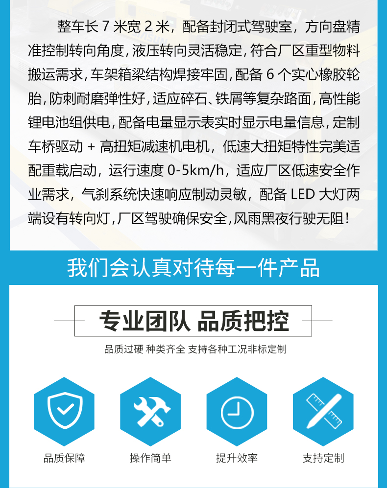 描   述: 電動(dòng)貨運(yùn)平板車,專為重型物料廠內(nèi)運(yùn)輸設(shè)計(jì)的無軌車,5.8米*2米加固平臺抗壓抗沖擊,前方配置1.2米長封閉駕駛室,通過方向盤和加速踏板實(shí)現(xiàn)靈活控制,視野開闊操作簡單舒適性好,搭配6個(gè)實(shí)心橡膠輪胎,確保高承載力和耐磨性,無懼碎石、鐵屑等復(fù)雜路面,免充氣設(shè)計(jì)杜絕爆胎風(fēng)險(xiǎn),電機(jī)減速機(jī)車橋驅(qū)動(dòng),動(dòng)力輸出穩(wěn)定強(qiáng)勁具備移動(dòng)爬坡能力,搭配氣剎制動(dòng),緊急制動(dòng)距離短反應(yīng)迅速!