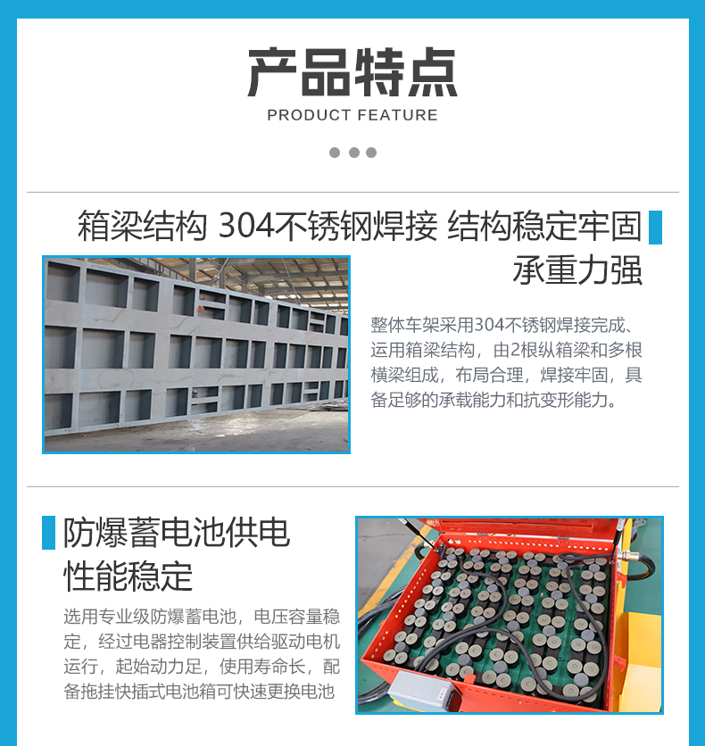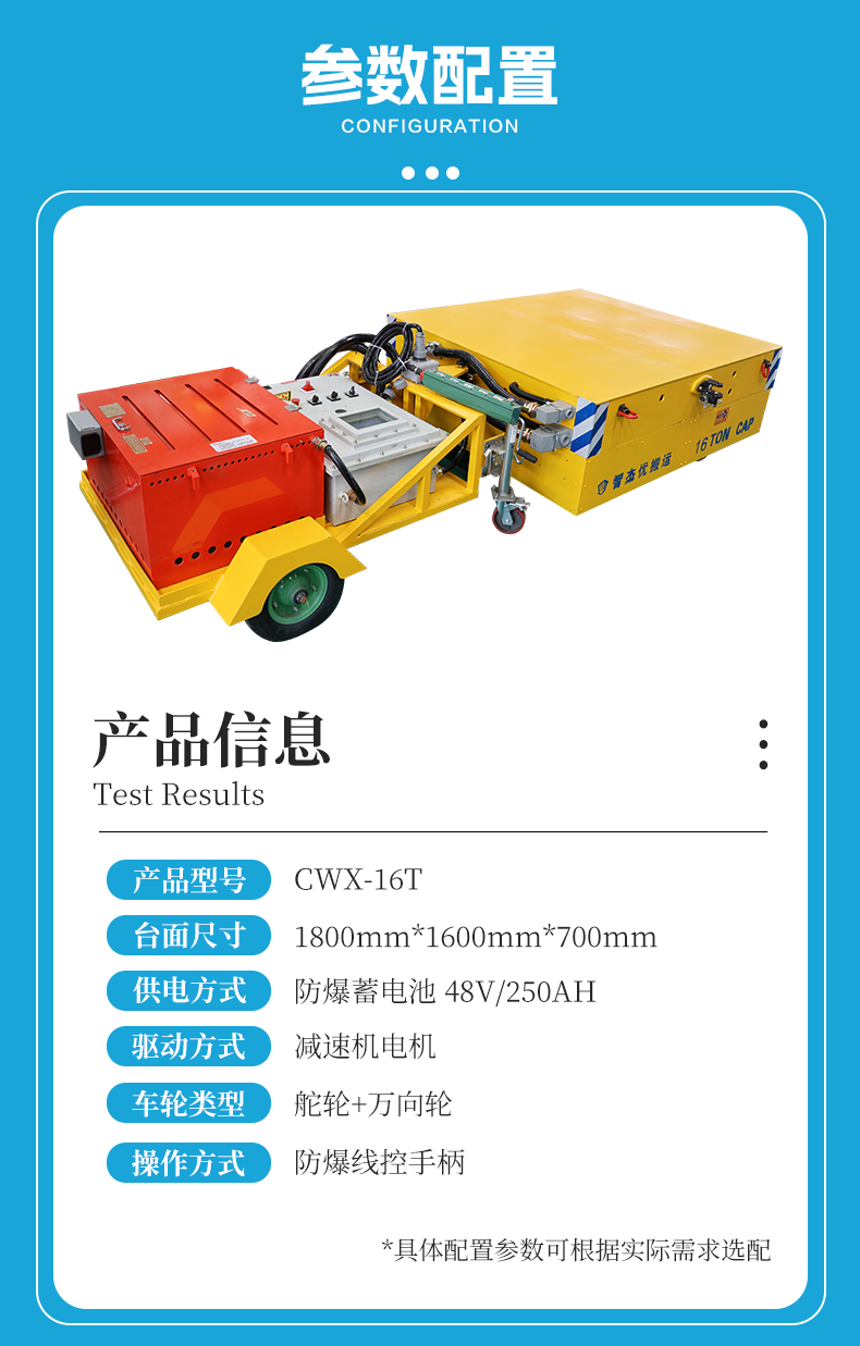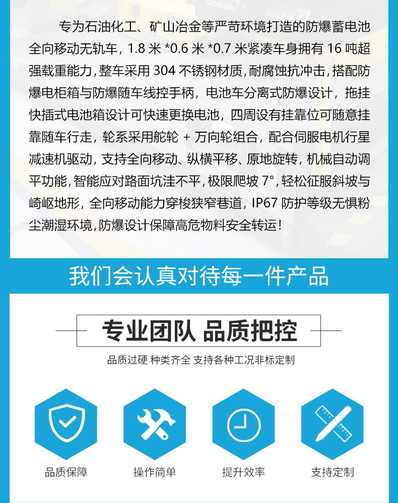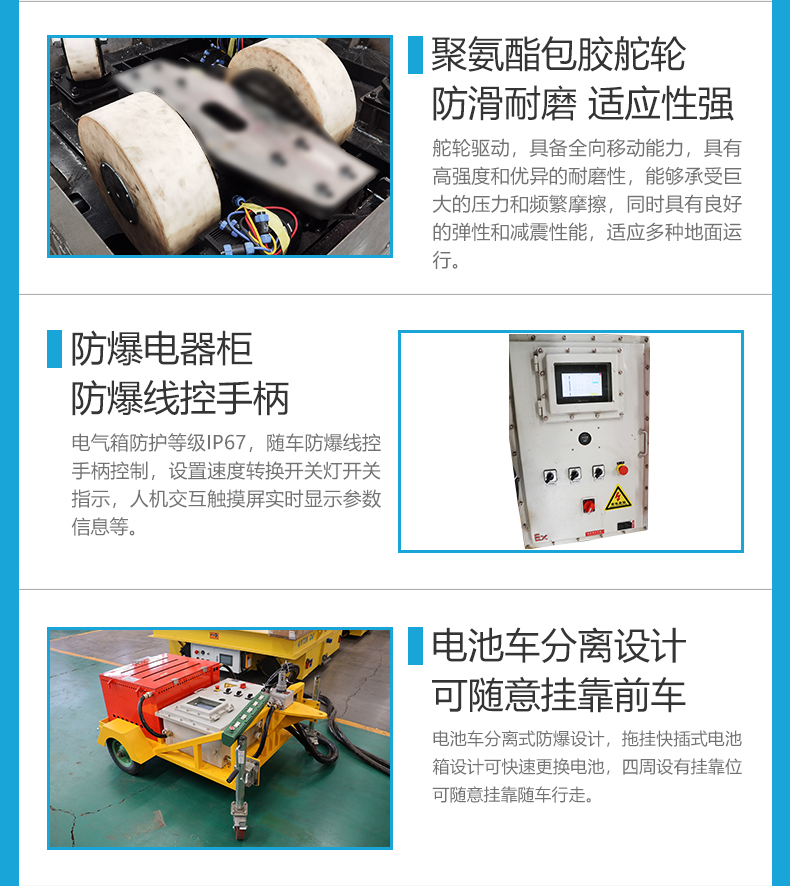 描   述: 防爆蓄電池全向移動無軌車,1.8米*0.6米*0.7米緊湊車身16噸***載重能力,整車304不銹鋼材質(zhì)耐腐蝕抗沖擊,搭配防爆電柜箱與防爆隨車線控手柄,電池車分離式防爆設(shè)計,拖掛快插式電池箱設(shè)計可快速更換電池,四周設(shè)有掛靠位可隨意掛靠隨車行走,舵輪+萬向輪組合配合伺服電機行星減速機驅(qū)動,支持全向移動、縱橫平移、原地旋轉(zhuǎn),機械自動調(diào)平功能,極限爬坡7°,IP67防護等級無懼粉塵潮濕環(huán)境,防爆設(shè)計