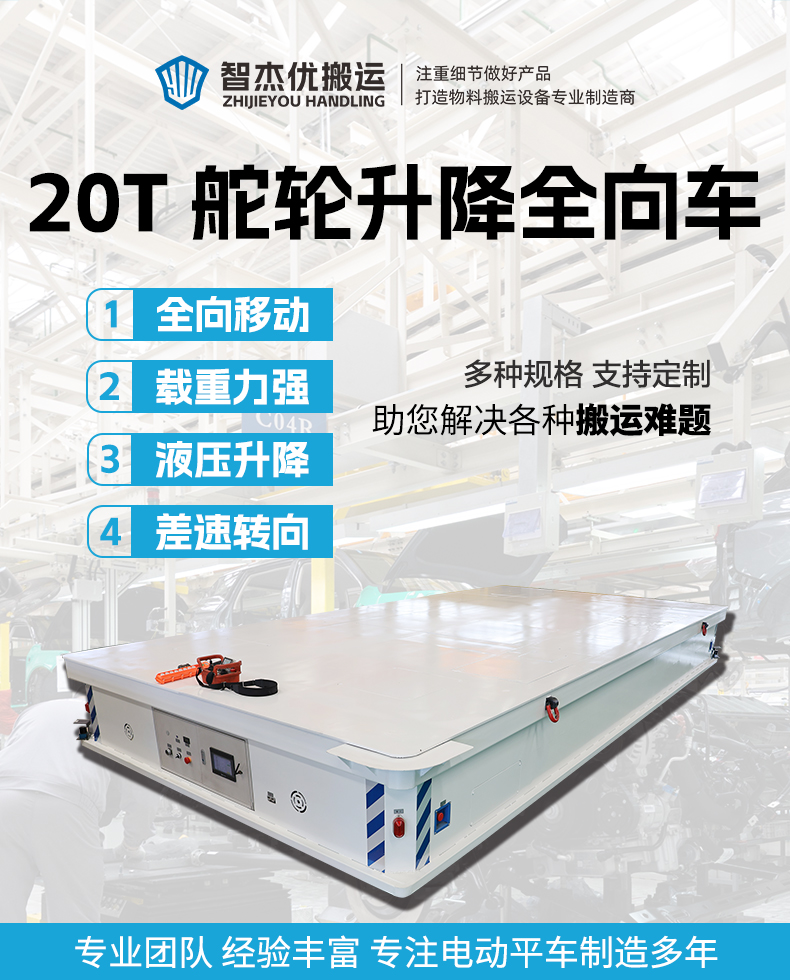 描   述: 20噸舵輪升降全向無軌車,6米*3米大平臺(tái)設(shè)計(jì)20噸額定載荷輕松承載重型設(shè)備、大型模具等物料過跨轉(zhuǎn)運(yùn)。搭載差速舵輪系統(tǒng),伺服電機(jī)行星減速機(jī)配合高精度編碼器控制輕松應(yīng)對狹窄通道、復(fù)雜路徑轉(zhuǎn)彎半徑小,具備全向移動(dòng)能力-縱橫移動(dòng)、米字斜行、原地旋轉(zhuǎn),臺(tái)面定制局部液壓升降行程100mm,可針對貨物進(jìn)行局部抬升調(diào)節(jié),磷酸鐵鋰電池組供電續(xù)航持久,人機(jī)交互觸摸屏,運(yùn)行參數(shù)實(shí)時(shí)監(jiān)控,大范圍雷達(dá)檢測,實(shí)時(shí)感知周圍環(huán)