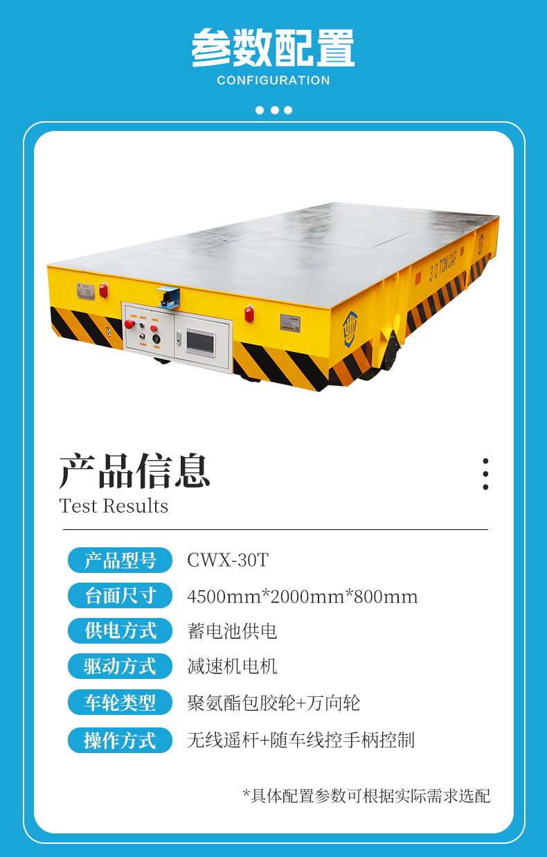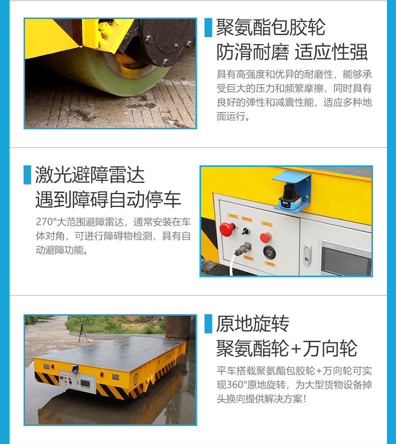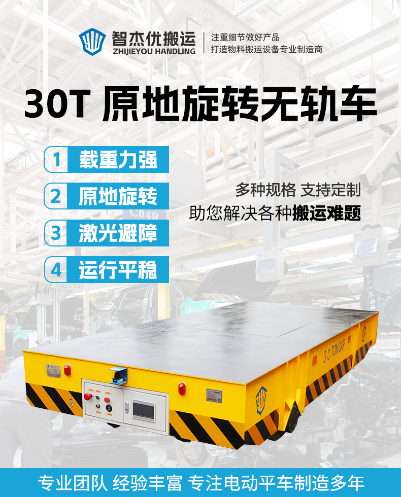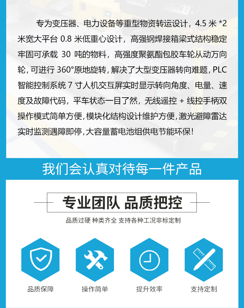 描   述: 專為變壓器、電力設(shè)備等重型物資轉(zhuǎn)運設(shè)計,4.5米*2米寬大平臺0.8米低重心設(shè)計,高強鋼焊接箱梁式結(jié)構(gòu)穩(wěn)定牢固可承載30噸的物料,高強度聚氨酯包膠車輪從動萬向輪,可進(jìn)行360°原地旋轉(zhuǎn),解決了大型變壓器轉(zhuǎn)向難題,PLC智能控制系統(tǒng)7寸人機交互屏實時顯示轉(zhuǎn)向角度、電量、速度及故障代碼,平車狀態(tài)一目了然,無線遙控+線控手柄雙操作模式簡單方便,模塊化結(jié)構(gòu)設(shè)計維護(hù)方便,激光避障雷達(dá)實時監(jiān)測遇障即停!