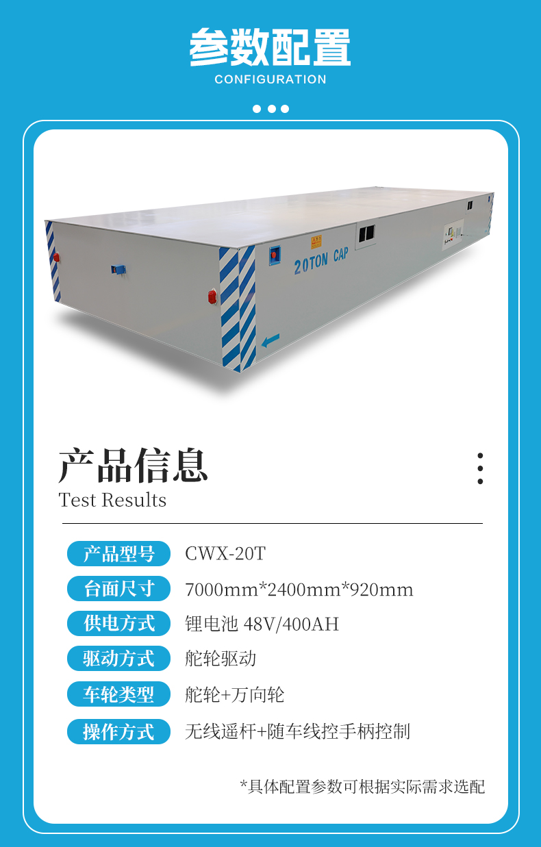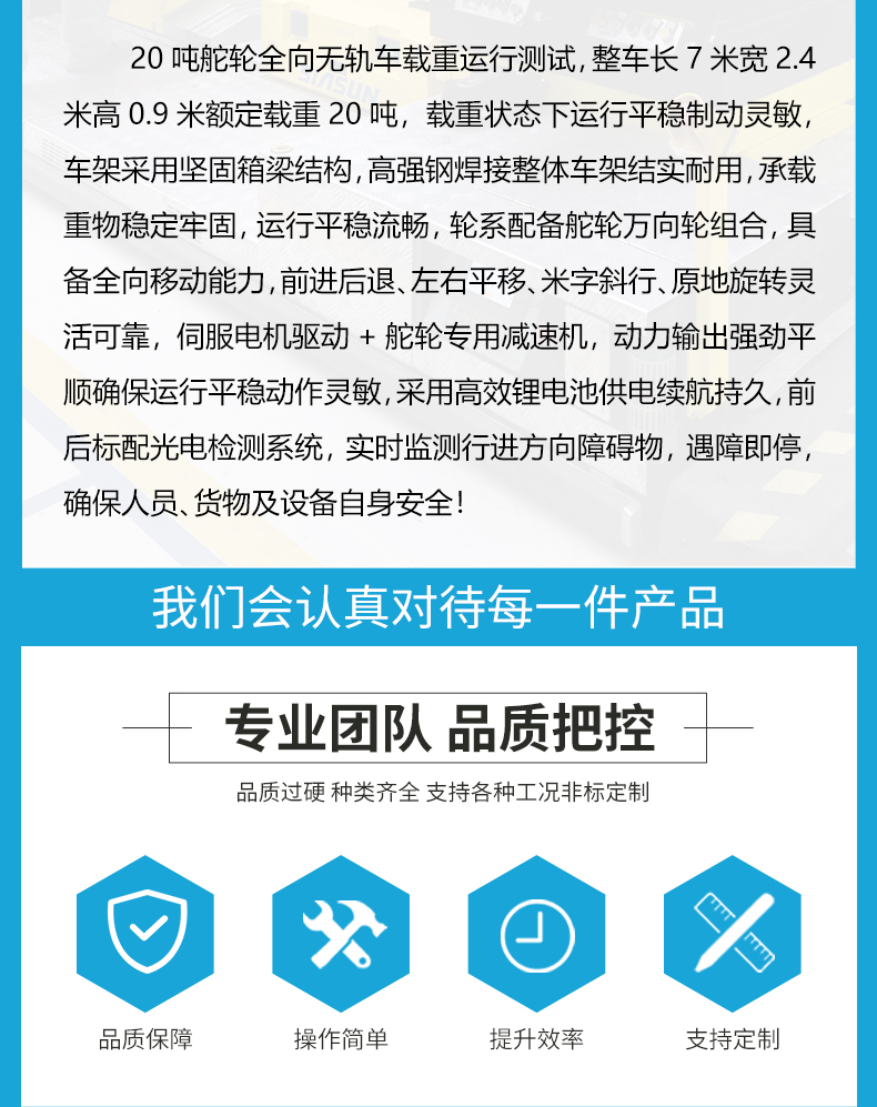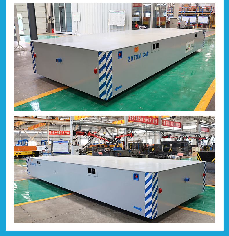 描   述: 20噸全向移動(dòng)無軌平板車,7米*2.4米寬大平臺0.9米定制高度,高強(qiáng)鋼焊接穩(wěn)定牢固輕松承載重型設(shè)備、大型模具,輪系配備2個(gè)高性能聚氨酯包膠舵輪+2個(gè)萬向輪組合,配合精密伺服電機(jī)減速機(jī)驅(qū)動(dòng)動(dòng)力澎湃輸出穩(wěn)定,集前進(jìn)后退、左右轉(zhuǎn)彎、縱橫移動(dòng)、米字斜行、原地旋轉(zhuǎn)于一身,聚氨酯材質(zhì)耐磨靜音不傷地面。無線搖桿+有線手柄兩種操作模式簡單方便上手快,光電檢測系統(tǒng)實(shí)時(shí)掃描障礙物,遇障自動(dòng)停車確保貨物人員安全。