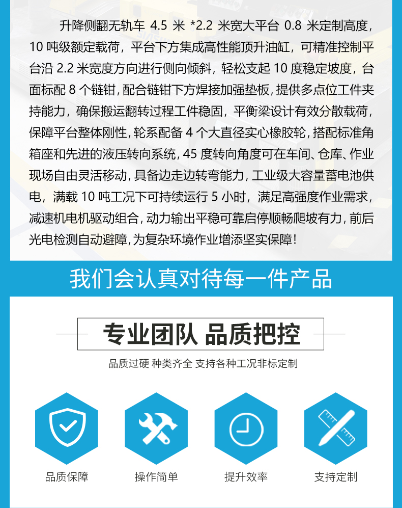 描   述: 升降側(cè)翻無軌車4.5米*2.2米寬大平臺0.8米定制高度,10噸級額定載荷,平臺下方集成高性能頂升油缸,可***控制平臺沿2.2米寬度方向進行側(cè)向傾斜,輕松支起10度穩(wěn)定坡度,臺面標配8個鏈鉗,提供多點位工件夾持能力,確保搬運翻轉(zhuǎn)過程工件穩(wěn)固,平衡梁設(shè)計有效分散載荷,輪系配備4個大直徑實心橡膠輪,45度轉(zhuǎn)向角度可在車間、倉庫、作業(yè)現(xiàn)場自由靈活移動,具備邊走邊轉(zhuǎn)彎能力,大容量蓄電池供電滿載10噸工況下