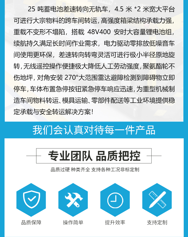 描   述: 25噸蓄電池差速轉(zhuǎn)向無(wú)軌轉(zhuǎn)運(yùn)車,搭載48V400安時(shí)大容量鋰電池組,續(xù)航持久滿足長(zhǎng)時(shí)間作業(yè)需求,差速轉(zhuǎn)向轉(zhuǎn)彎靈活可進(jìn)行極小半徑原地旋轉(zhuǎn),對(duì)角安裝270°大范圍雷達(dá)避障檢測(cè)到障礙物立即停車,為重型機(jī)械制造車間物料轉(zhuǎn)運(yùn)、模具運(yùn)輸、零部件配送等工業(yè)環(huán)境提供穩(wěn)定承載與安全轉(zhuǎn)運(yùn)解決方案!