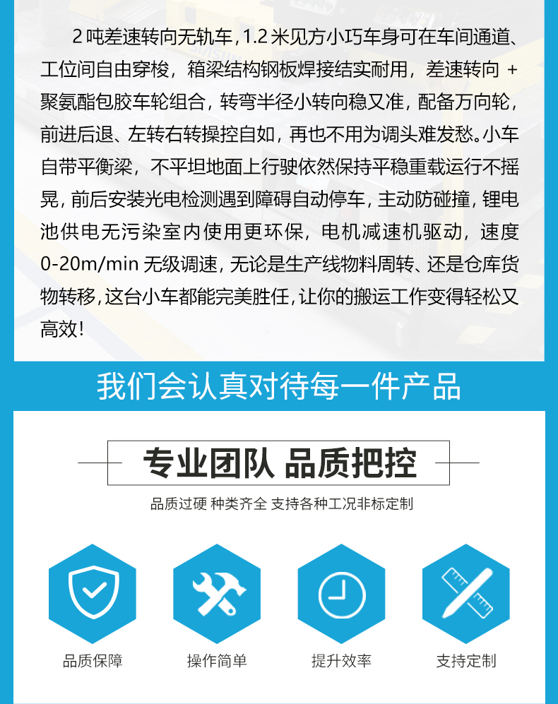 描   述: 2噸差速轉(zhuǎn)向無軌車,1.2米見方小巧車身可在車間通道、工位間自由穿梭,差速轉(zhuǎn)向+聚氨酯包膠車輪組合,轉(zhuǎn)彎半徑小轉(zhuǎn)向穩(wěn)又準(zhǔn),配備萬向輪左轉(zhuǎn)右轉(zhuǎn)操控自如,再也不用為調(diào)頭難發(fā)愁。無論是生產(chǎn)線物料周轉(zhuǎn)、還是倉庫貨物轉(zhuǎn)移,這臺小車都能***勝任,讓你的搬運(yùn)工作變得輕松又高效!