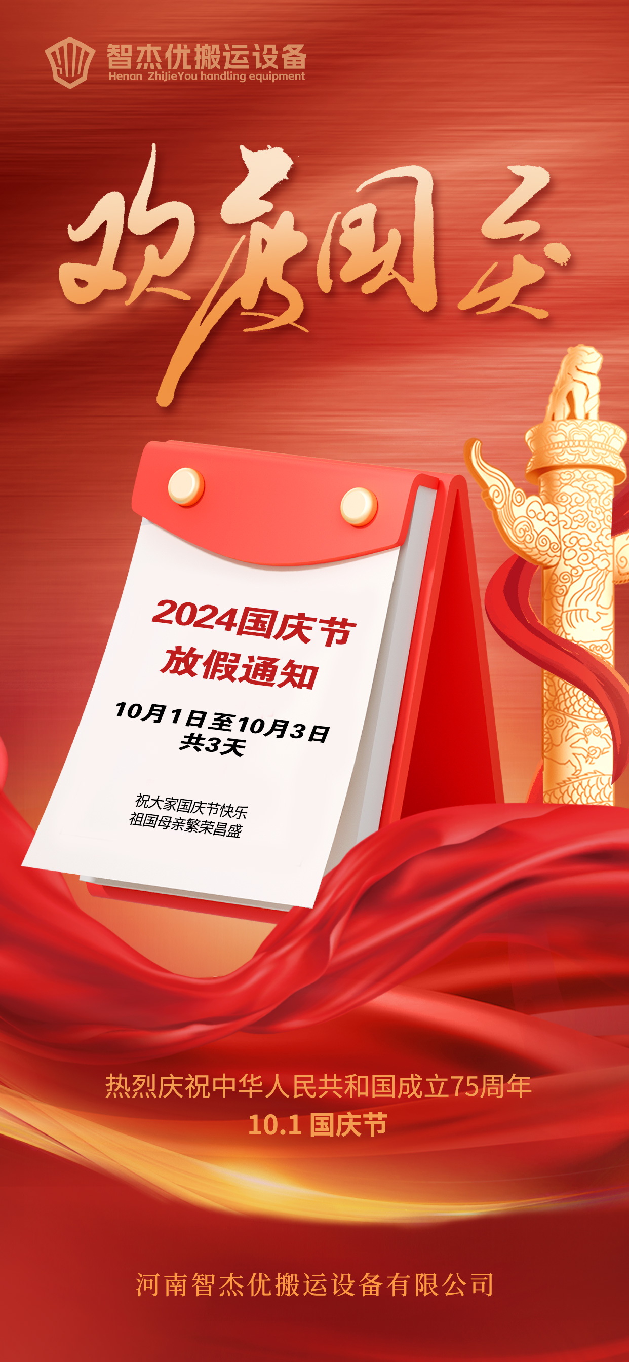 紅旗漫卷舞翩翩,國(guó)慶歡歌震九天。我們即將迎來(lái)偉大祖國(guó)的75周歲生日-國(guó)慶節(jié),根據(jù)公司安排,現(xiàn)將放假安排如下: