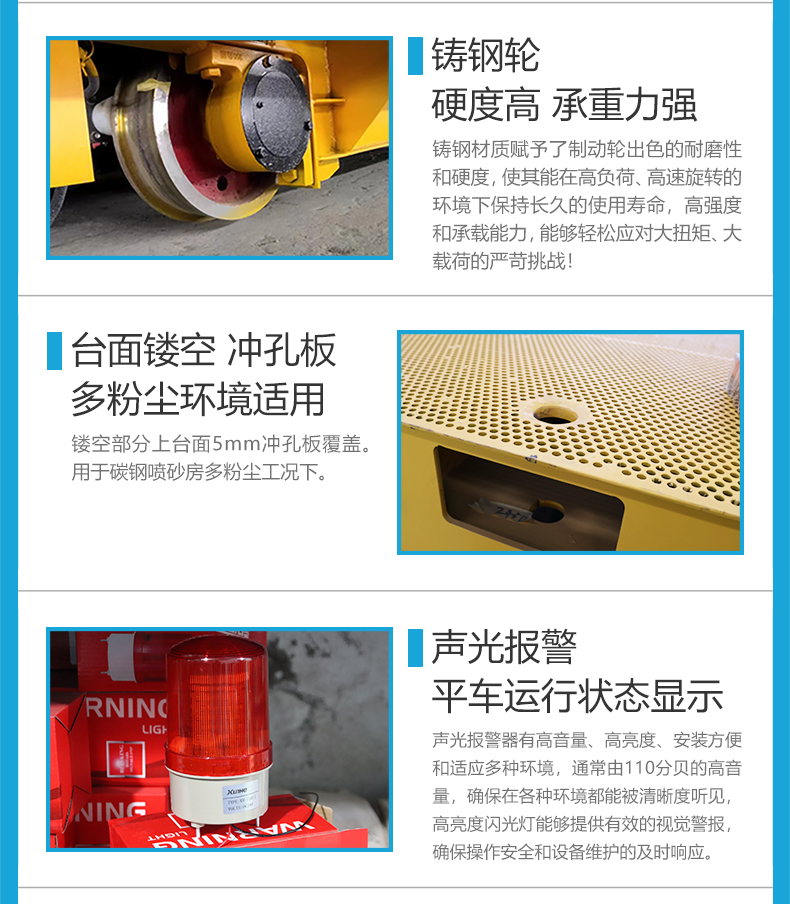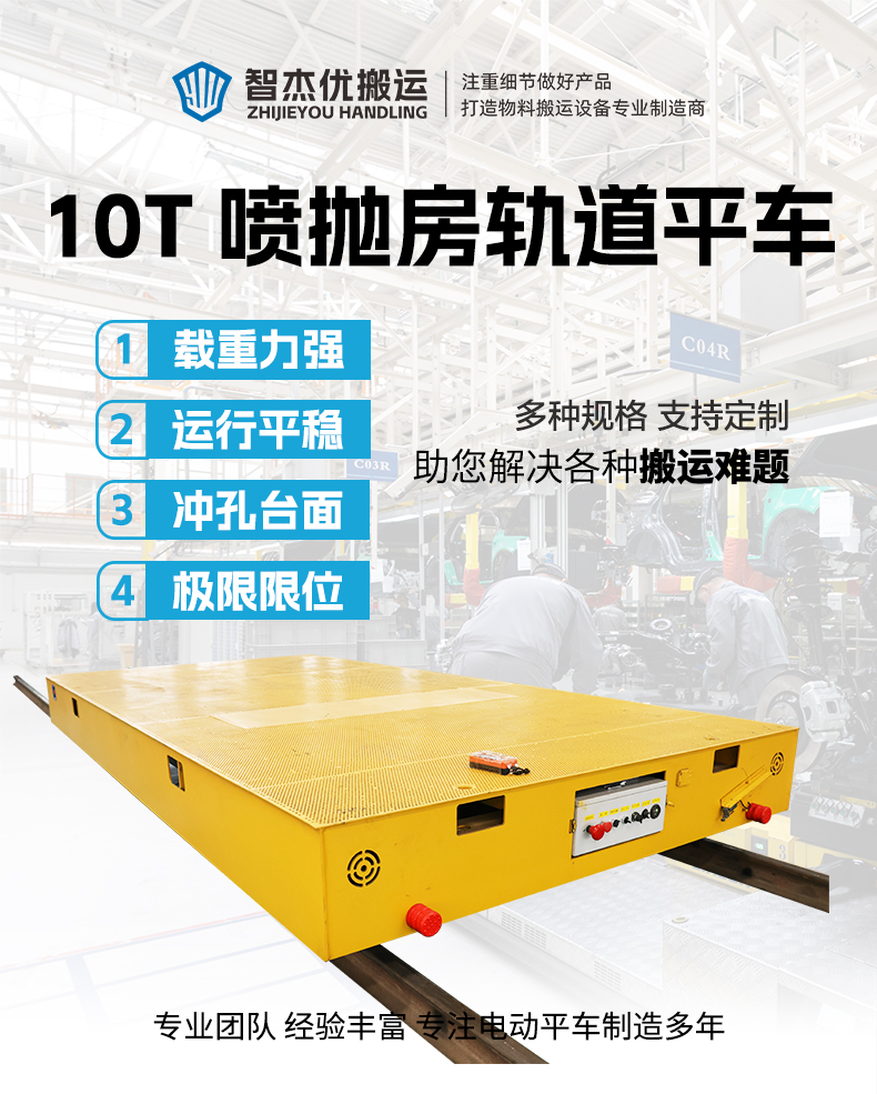 描   述: 噴拋一體房專用軌道平板車,5米*2.5米寬大平臺,匹配10噸額定載重,輕松應對工件、機械設備及批量物料的轉(zhuǎn)運需求。0.5米低重心設計運行平穩(wěn)無傾覆風險,保障作業(yè)安全。臺面5mm沖孔板覆蓋鏤空區(qū)域,蜂窩狀孔洞設計,快速排水排屑,防滑防積塵,適應噴拋、清洗等濕滑工況。減速機電機驅(qū)動,啟停平穩(wěn)無沖擊。