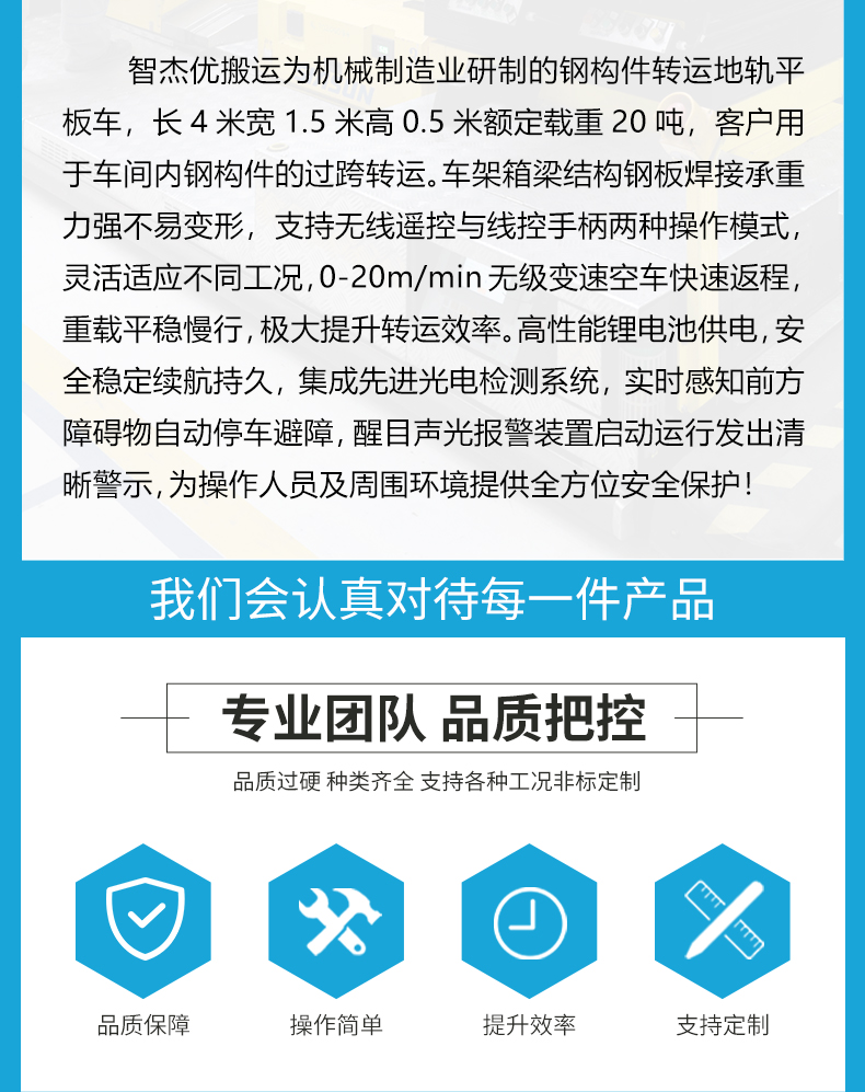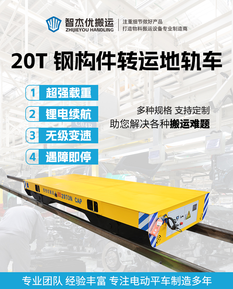 描   述: 鋼構(gòu)件轉(zhuǎn)運(yùn)地軌平板車,長(zhǎng)4米寬1.5米高0.5米額定載重20噸,客戶用于車間內(nèi)鋼構(gòu)件的過跨轉(zhuǎn)運(yùn)。車架箱梁結(jié)構(gòu)鋼板焊接承重力強(qiáng)不易變形,0-20m/min無(wú)級(jí)變速空車快速返程,重載平穩(wěn)慢行,極大提升轉(zhuǎn)運(yùn)效率。高性能鋰電池供電,安全穩(wěn)定續(xù)航持久,***光電檢測(cè)實(shí)時(shí)感知前方障礙物自動(dòng)停車避障,醒目聲光報(bào)警啟動(dòng)運(yùn)行發(fā)出清晰警示,為操作人員及周圍環(huán)境提供全方位安全保護(hù)!