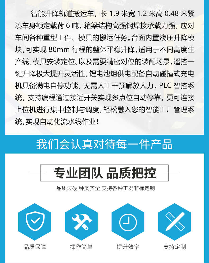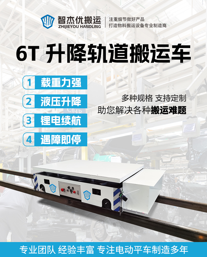 描   述: 6噸升降式軌道搬運(yùn)車,長1.9米寬1.2米高0.48米定制化緊湊車身,堅(jiān)固箱梁結(jié)構(gòu)承載力強(qiáng)穩(wěn)定牢固,長期使用不變形不塌陷,無線遙控操作簡單便捷,臺面定制升降模塊只進(jìn)行高低場景的物料搬運(yùn),極大提升靈活性與生產(chǎn)效率!