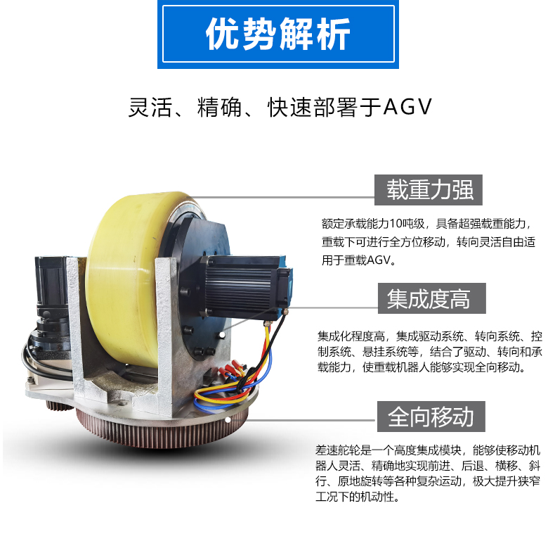 描   述: 6噸級(jí)重載臥式舵輪,集成驅(qū)動(dòng)、轉(zhuǎn)向、稱重三大功能于一體,額定負(fù)載高達(dá)6噸,輕松驅(qū)動(dòng)大型物料、重型設(shè)備,滿足冶金、重型機(jī)械等行業(yè)高強(qiáng)度運(yùn)輸需求。臥式結(jié)構(gòu)深度優(yōu)化安裝空間,顯著降低AGV底盤高度,輕松穿越低矮區(qū)域提升空間利用率。支持±90°甚至更大角度轉(zhuǎn)向,實(shí)現(xiàn)零半徑轉(zhuǎn)彎、側(cè)移、斜行等高階運(yùn)動(dòng)。