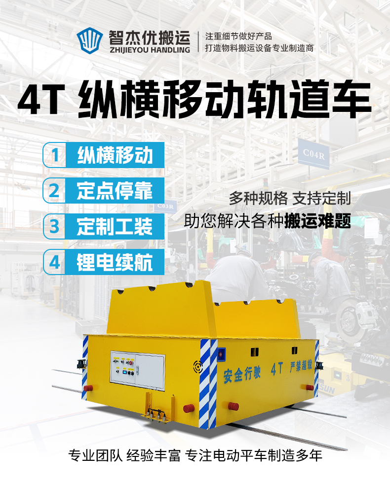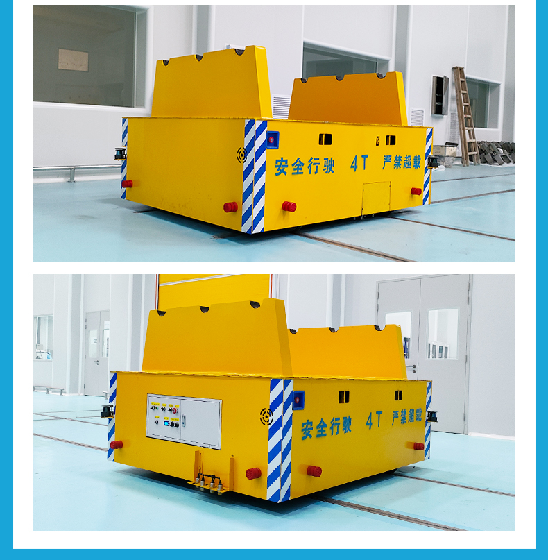 描   述: 智杰優(yōu)搬運制造的縱橫移動軌道車,整車長2米寬1.8米高0.75米額定載重4噸,客戶用于銅箔卷的跨車間運輸作業(yè)。車架箱梁結(jié)構(gòu)結(jié)實耐用,臺面鋪設(shè)2mm304花紋鋼板,兩側(cè)裝有輥軸支架,用于放置銅箔卷。配備8只鑄鋼車輪可進(jìn)行上下升降變軌實現(xiàn)軌道車縱橫移動,根據(jù)軌道鋪設(shè)路線十字交叉運行,進(jìn)行跨車間的物料運輸,定位傳感器限位開關(guān)控制軌道車停車精度,提前減速緩慢停車***換軌自動運行。
