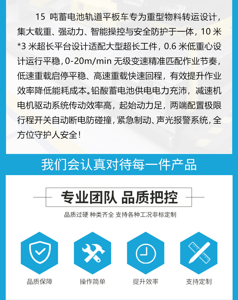 描   述: 15噸蓄電池軌道平板車專為重型物料轉(zhuǎn)運(yùn)設(shè)計(jì),集大載重、強(qiáng)動(dòng)力、智能操控與安全防護(hù)于一體,10米*3米超長(zhǎng)平臺(tái)設(shè)計(jì)適配大型超長(zhǎng)工件,0.6米低重心設(shè)計(jì)運(yùn)行平穩(wěn),0-20m/min無級(jí)變速***匹配作業(yè)節(jié)奏,低俗重載啟停平穩(wěn)、高速重載快速回程,有效提升作業(yè)效率降低能耗成本。鉛酸蓄電池供電電力充沛,減速機(jī)電機(jī)驅(qū)動(dòng)系統(tǒng)傳動(dòng)效率高,起始動(dòng)力足,兩端配置極限行程開關(guān)自動(dòng)斷電防碰撞,緊急制動(dòng)、聲光報(bào)警系統(tǒng)!